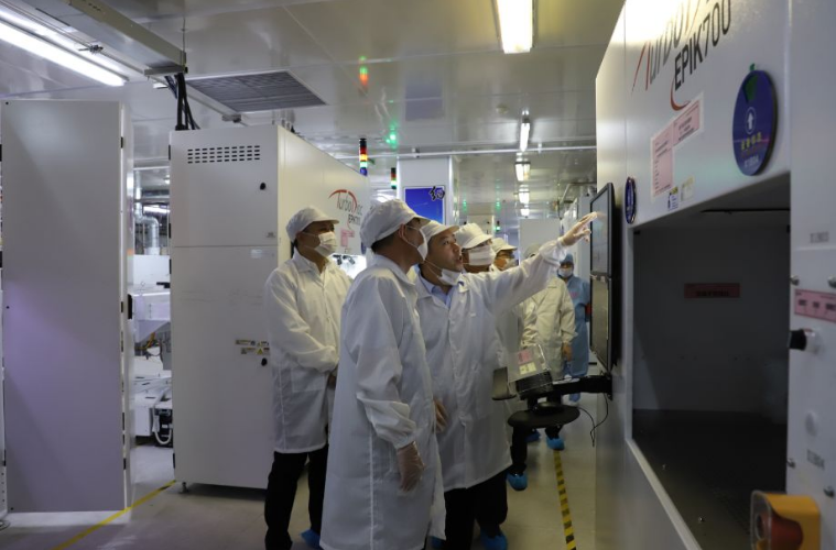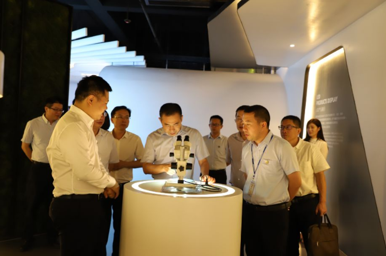 考察組一行參觀了公司展廳,了解乾照光電的發展歷程,體驗公司產品在照明、顯示、背光、航天等終端應用領域的成果,深入到生產車間了解研發和生產過程。各位領導對我司產品的高技術含量、生產制造的工藝水平以及自動化普及程度均表示贊同和認可。