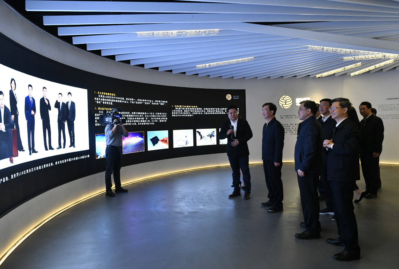 在公司展廳,王書記認真聽取了金章育關于公司發展情況的匯報。乾照光電擁有全球最大的砷化鎵化合物半導體芯片生產基地,成長性位居中國30多家LED相關A股上市公司之首,這引起了王書記的濃厚興趣。他詢問了公司的技術研發投入情況,當了解到公司每年都投入大量資金用于技術研發的情況后,他對乾照光電依靠技術創新驅動企業發展的戰略表示了高度的肯定和贊許。