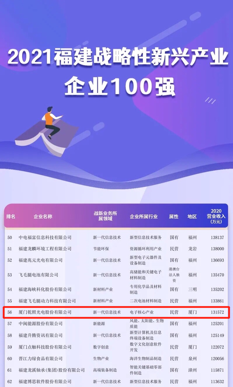 乾照光電榮獲“2021福建戰略性新興產業企業100強”