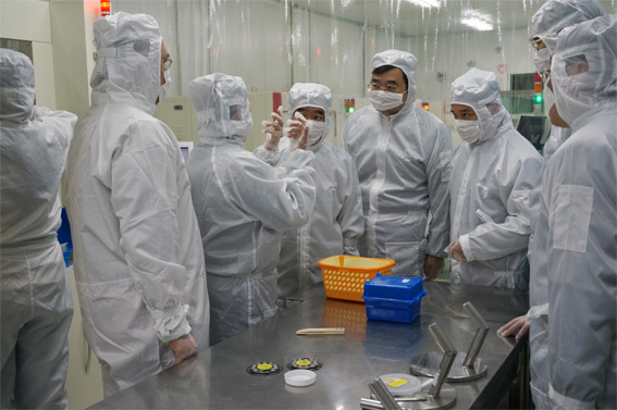 此次調研,我們陪同市委組織部的領導們參觀了芯片車間的工藝流程,并做了簡單的工藝介紹。為了能夠近距離的了解到我們的產(chǎn)品,在開發(fā)區(qū)管委會主任季允豐的陪下,同市委組織部部長張愛軍等一行6人便穿著無塵服前去外研車間近距離的觀察、了解我們的產(chǎn)品及性能介紹,并對我揚州乾照光電有限公司引進的高層次人才給予了高度的認可。