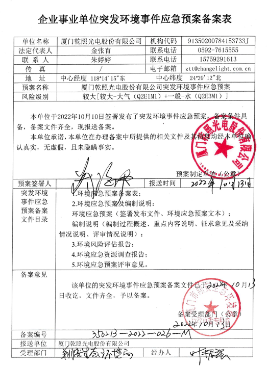 廈門乾照光電股份有限公司突發環境事件應急預案公示