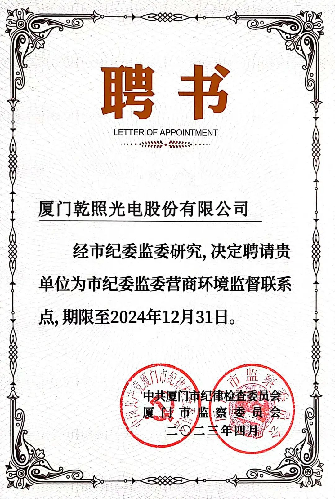 近期,經廈門市紀委監委研究確定,乾照光電被聘請為“廈門市紀委監委營商環境監督聯系點”,受聘期至2024年12月31日。