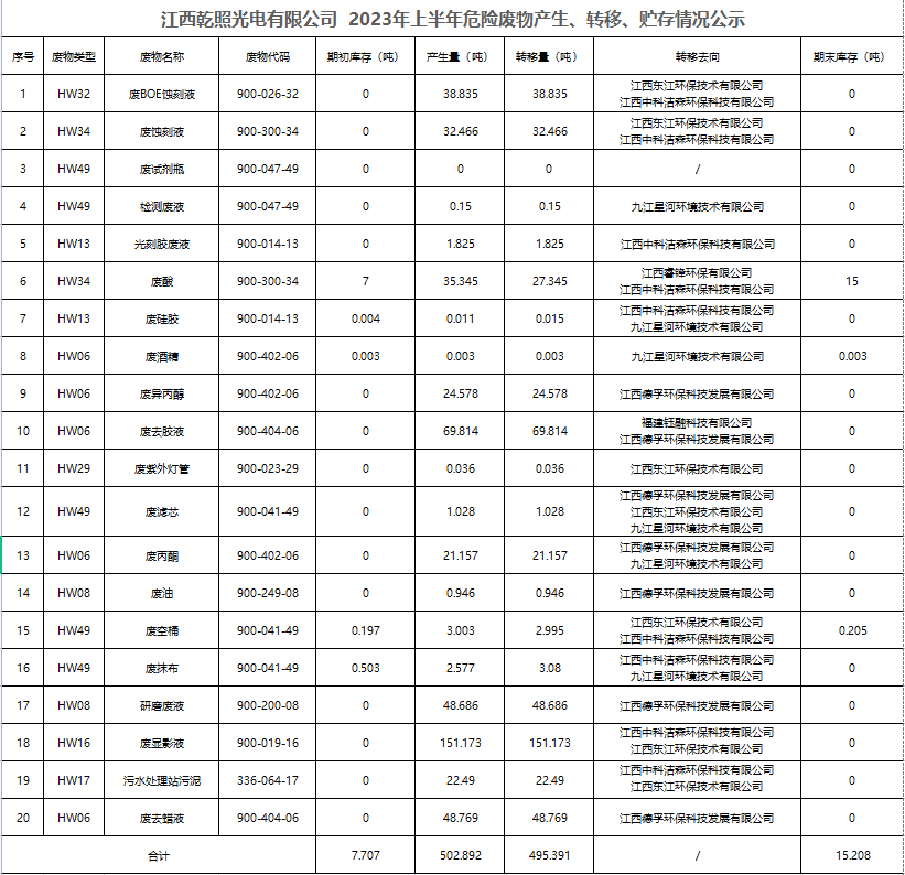 江西乾照光電有限公司2023年上半年危險廢物產生、轉移、貯存情況公示