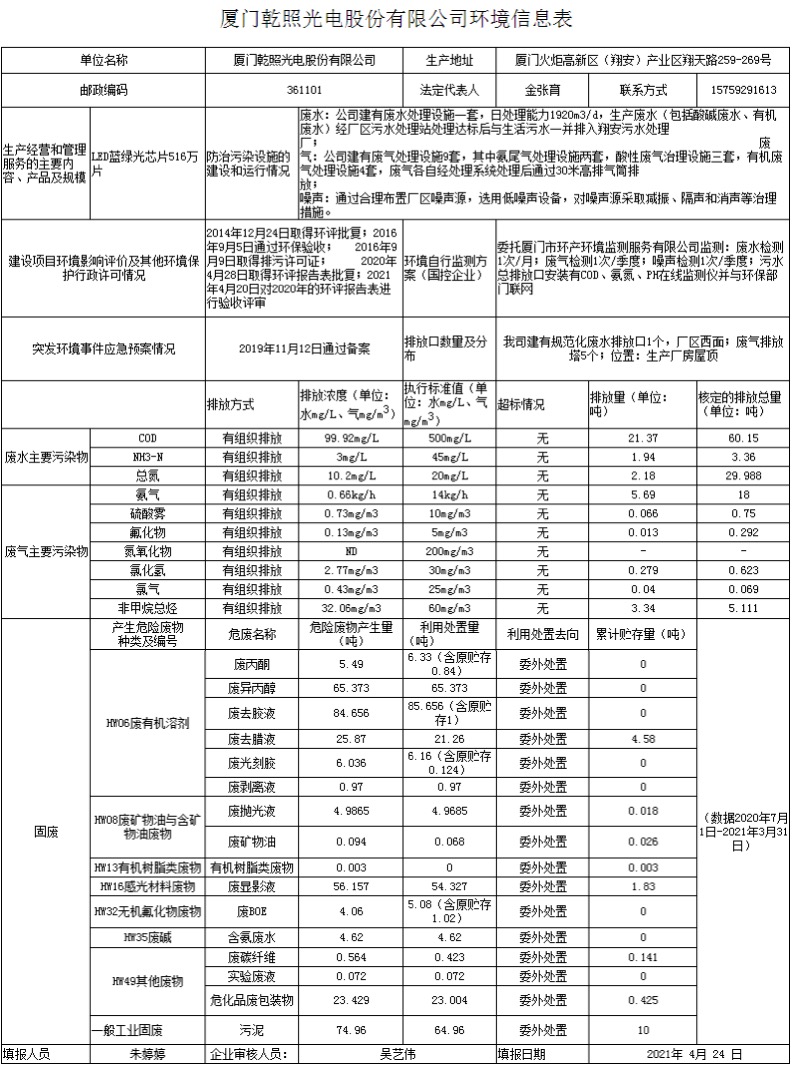 揚州乾照光電有限公司2021年第一季度危廢產生、轉移、貯存情況公示