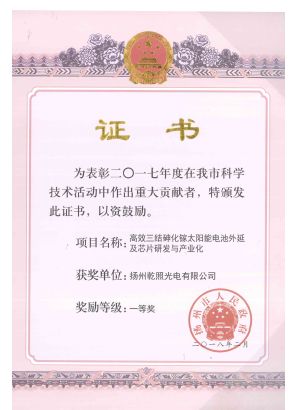 日前,揚(yáng)州市政府公布了2017年度科學(xué)技術(shù)獎獲獎情況。揚(yáng)州乾照光電有限公司申報的“高效三結(jié)砷化鎵太陽電池外延及芯片研發(fā)與產(chǎn)業(yè)化”項目,在眾多優(yōu)秀成果中脫穎而出,榮獲揚(yáng)州市科技進(jìn)步獎一等獎。 該項目采用頂電...