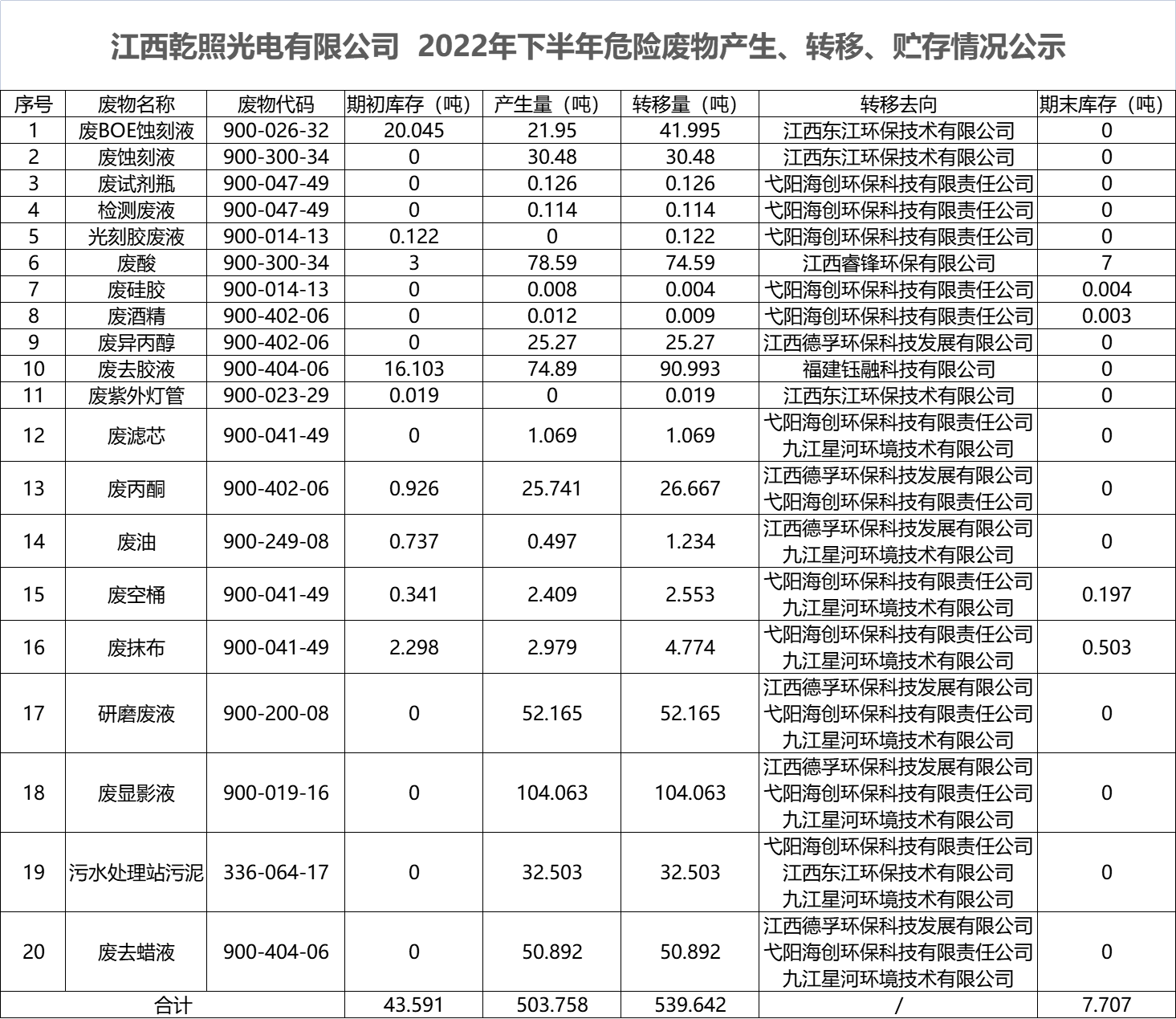 江西乾照光電有限公司2022年下半年危險廢物產(chǎn)生、轉移、貯存情況公示